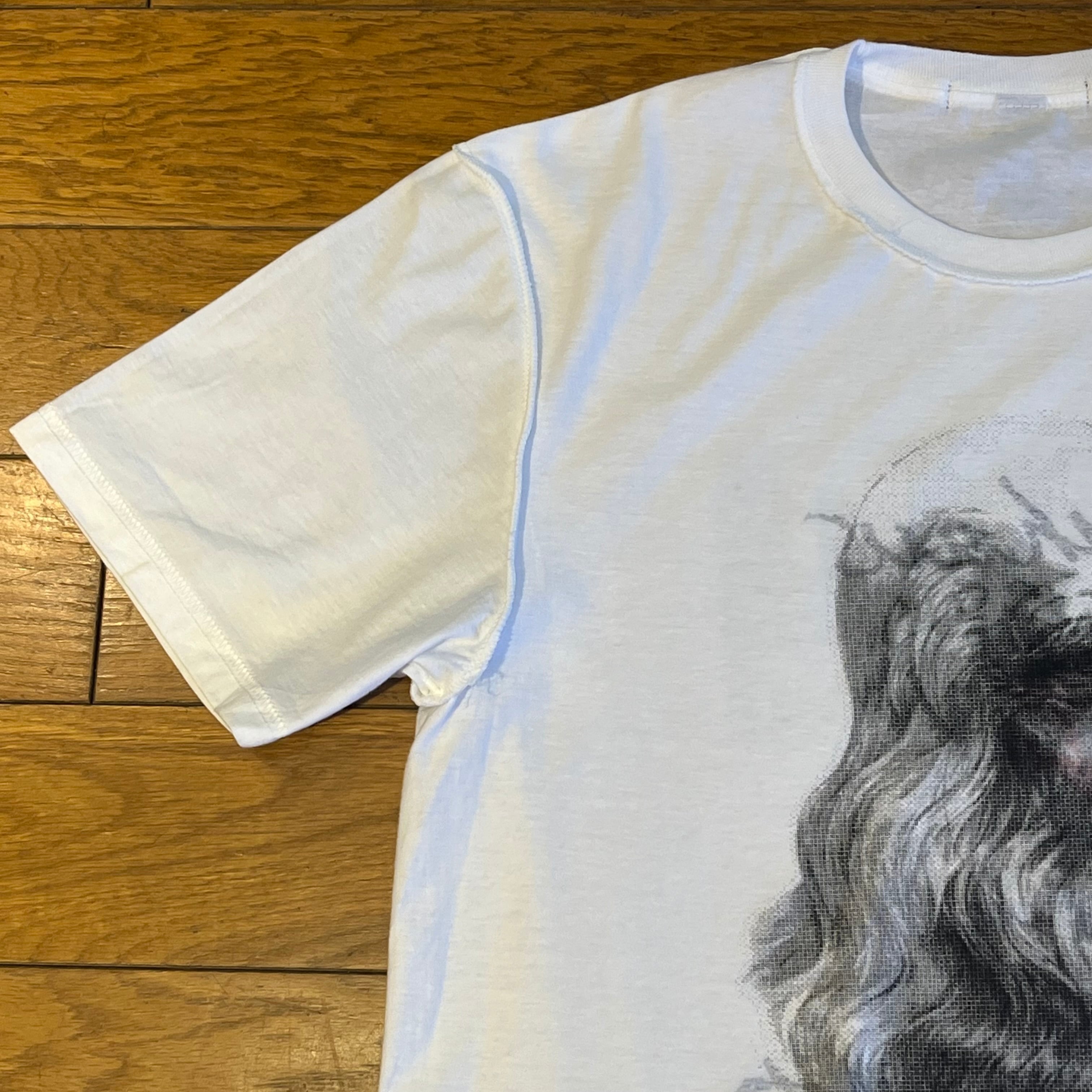 ダ・ヴィンチの肖像画をフロントに、最後の晩餐をバックにプリントし、インサイドアウトで着れるようなアイディアに。本来の表に入っているバンドのプリントが薄っすらと透けて見えるのが狙い。表裏両A面のため、どちらを表にして着ても構いません。
